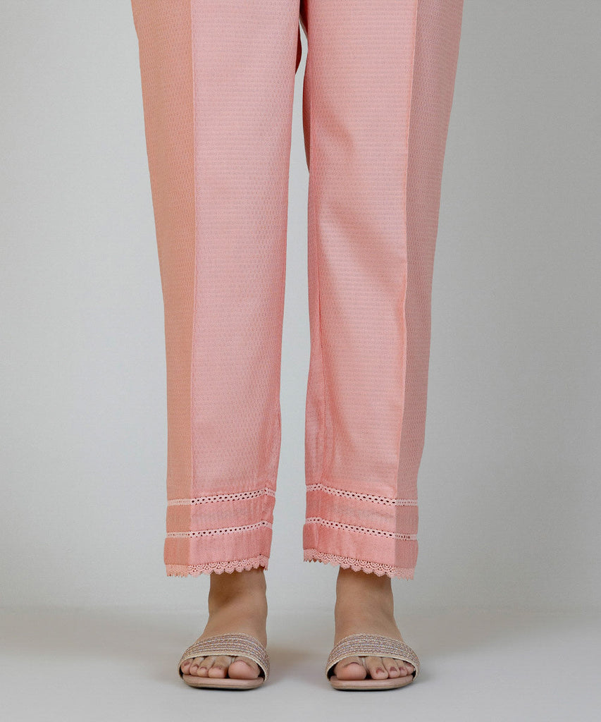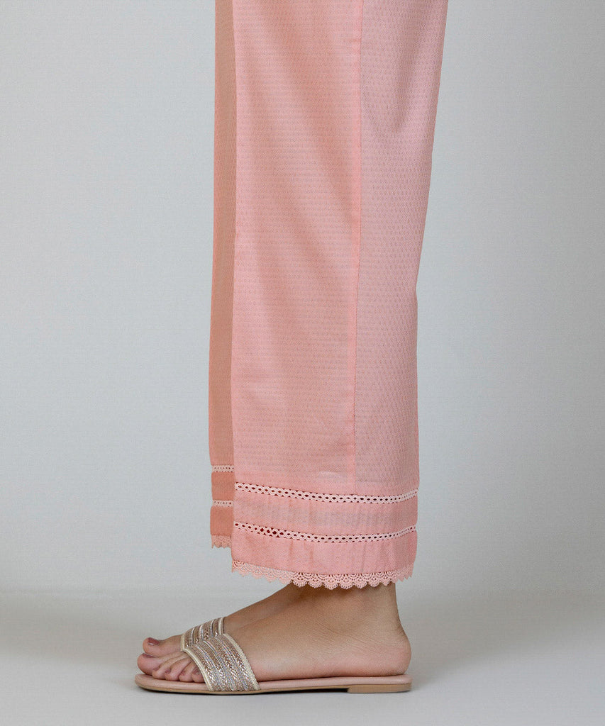 Complete your outfit with our peach pink straight pants with lace detailing.