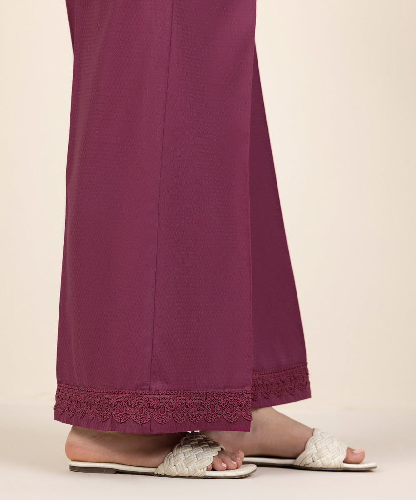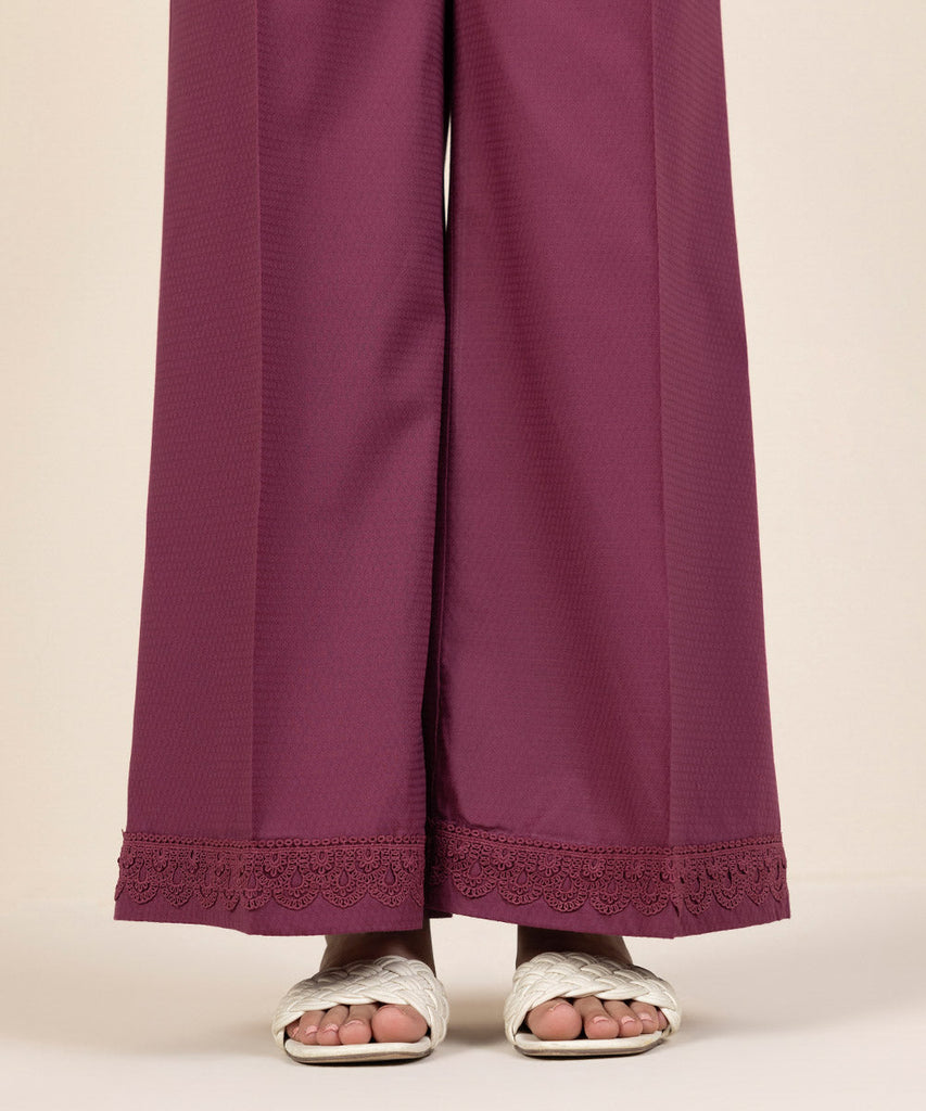Complete your Eid look in our magenta dobby flared pants with lace.