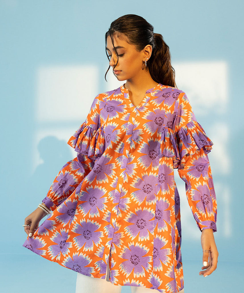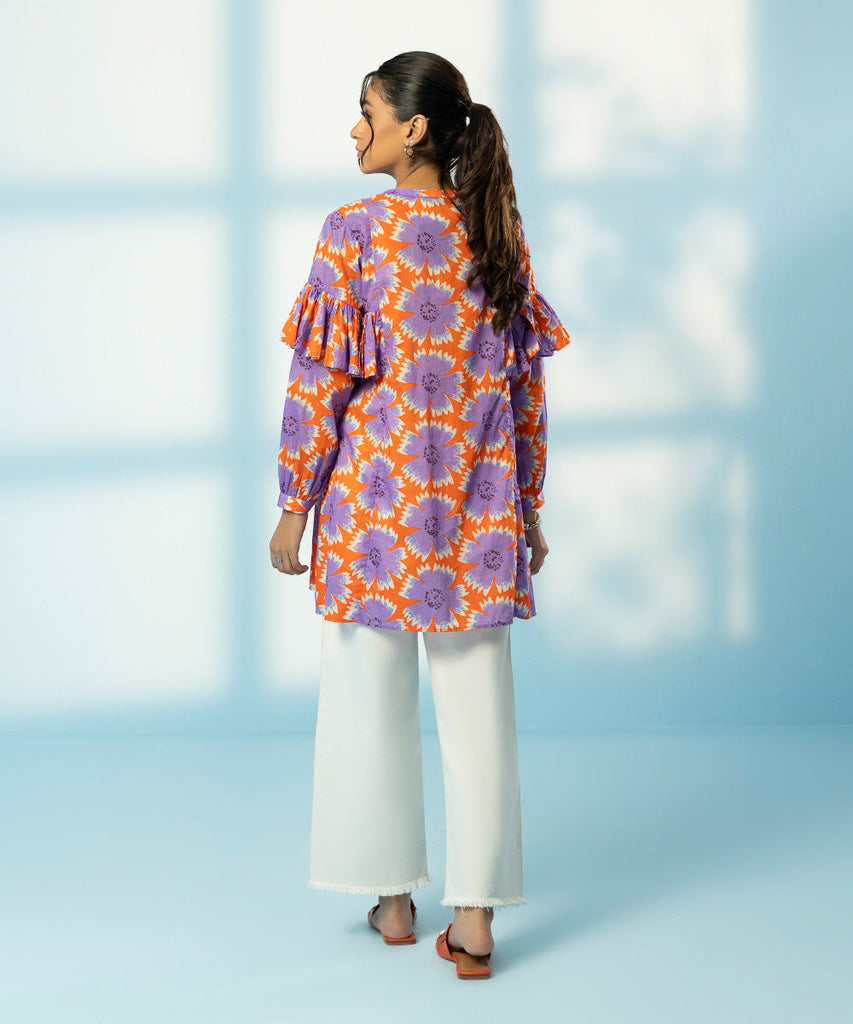 Adorn bright hues with this short length printed fusion lawn shirt in purple. Details: Printed front, Printed back, R...