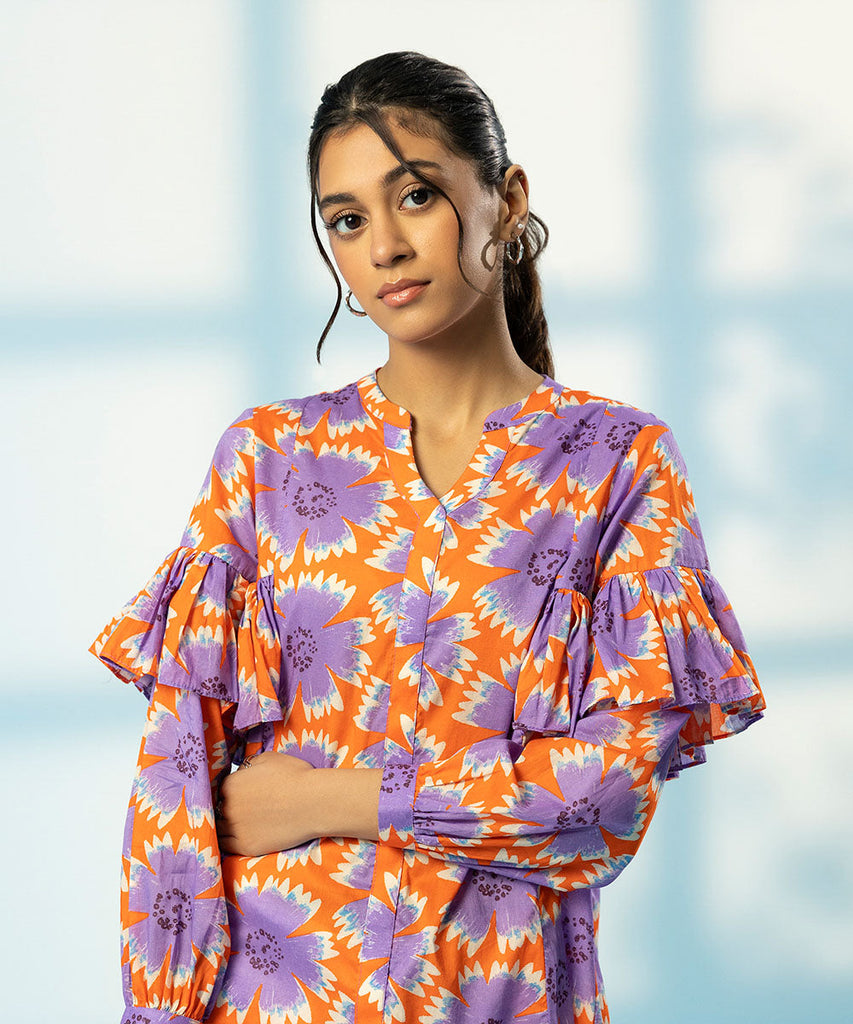 Adorn bright hues with this short length printed fusion lawn shirt in purple.