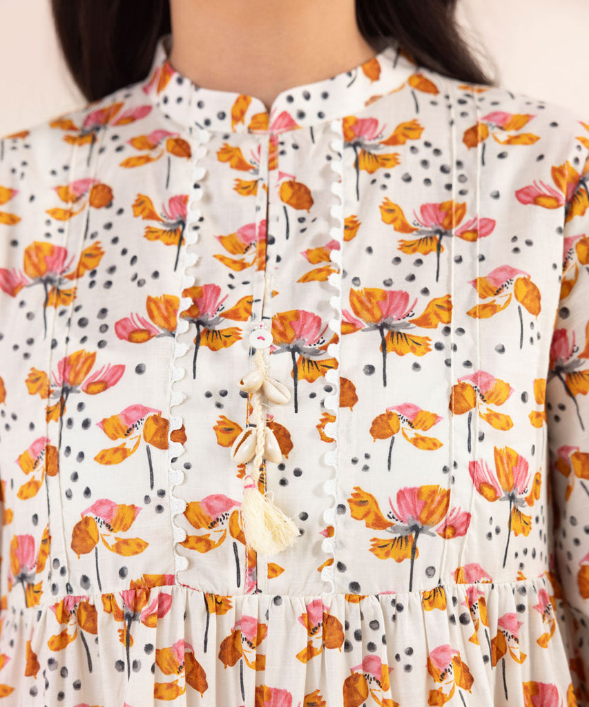 Printed Front, Printed Back, Full Sleeves, Band Neckline with slit & tassels