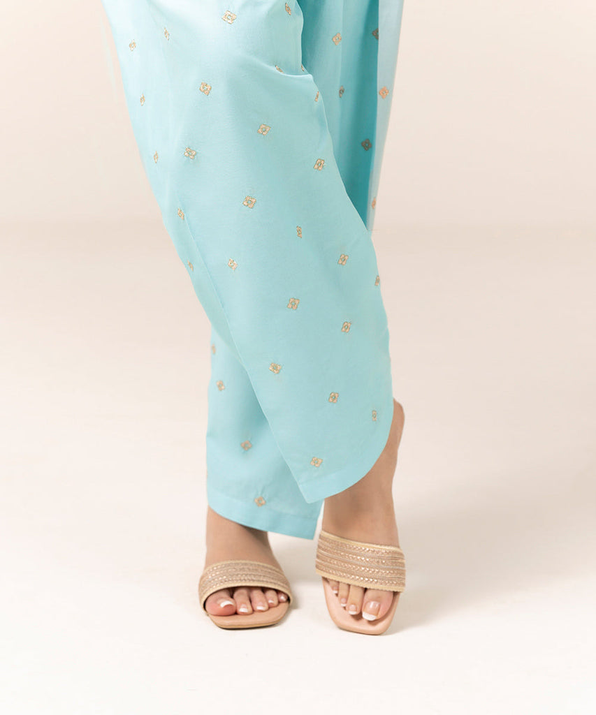 Enhance your outfit with our blue embroidered cambric shalwar.