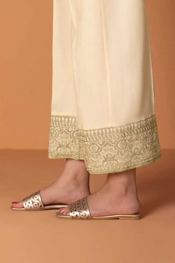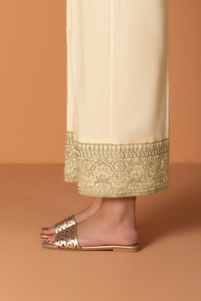 Uplift your look with ivory silk culottes featuring an accented hem.