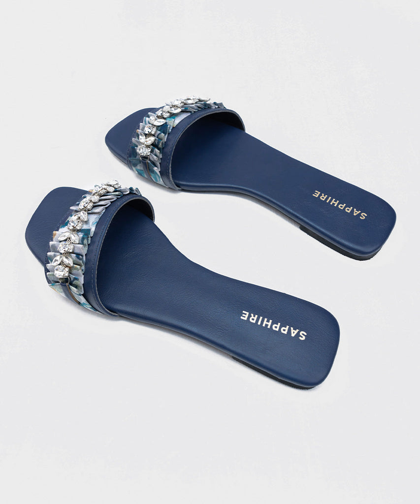 Elevate your festive look with our square-toe shaped blue flats with printed silk pleats on top.