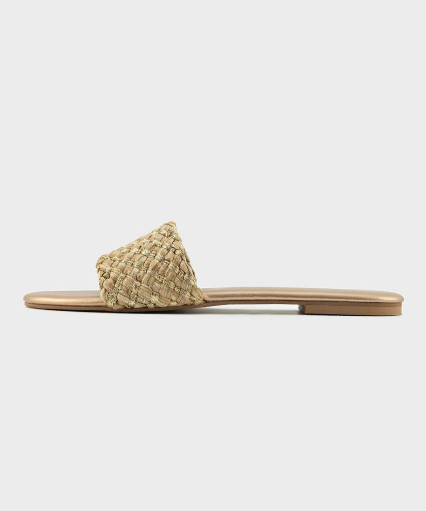 Uplift your style in our peach, round-toe mule sandals with a gold accented soft straw weaved upper.