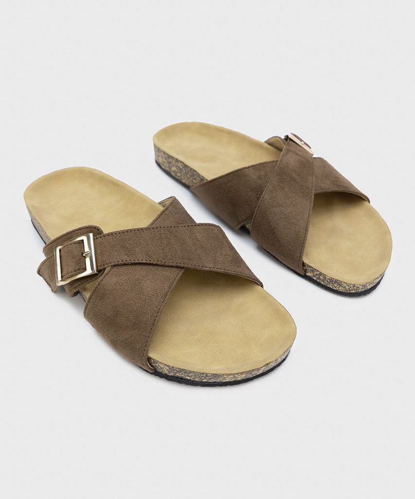 Choose comfort and style in our brown round-toe flats with gold buckle detail on top.