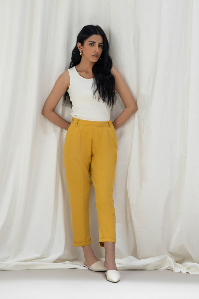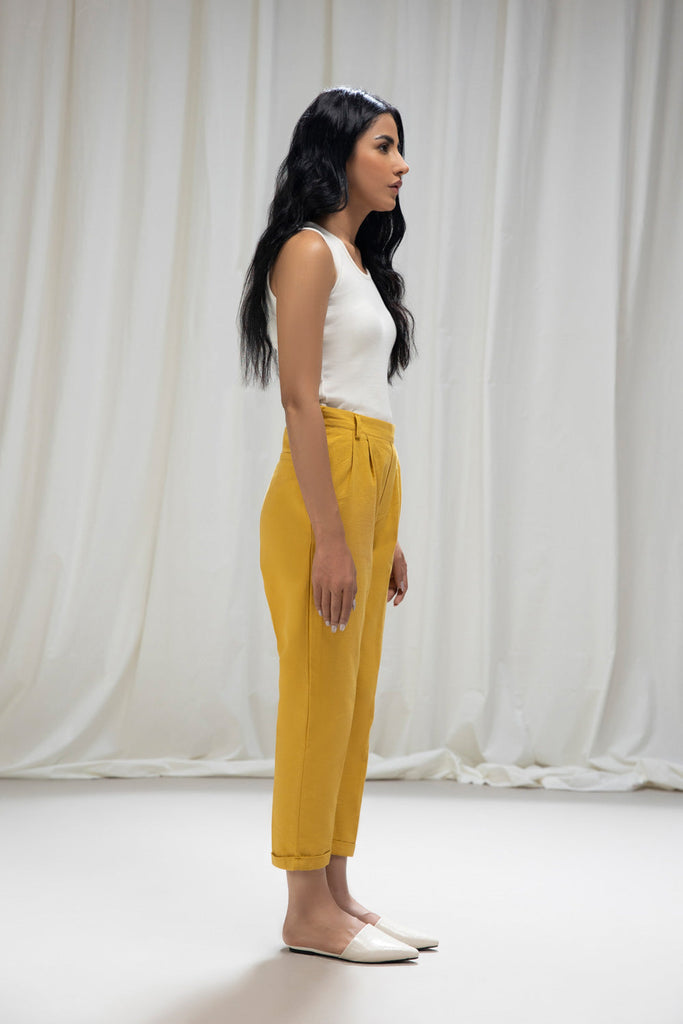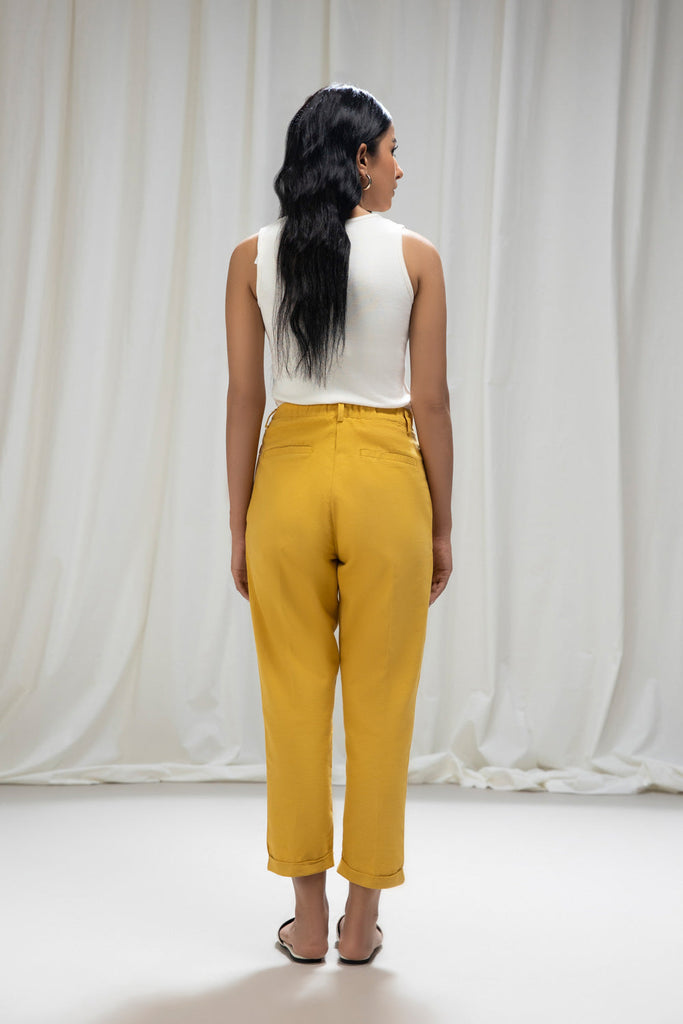 Trousers made in textured cotton fabric. Side seam pockets. Elasticated back waist band with zip side seam closure. Back faux pockets. Turn-up hem.