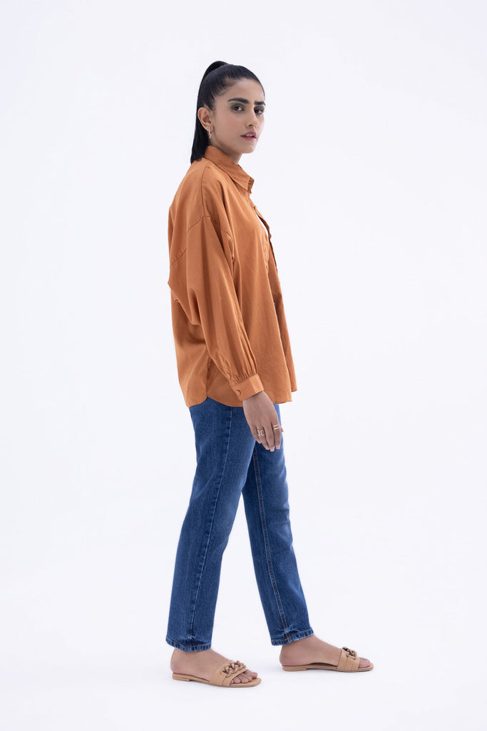 Loose Fit Button Down Top Solid loose fit button through shirt. Front patch pocket. Drop shoulders and voluminous sl...