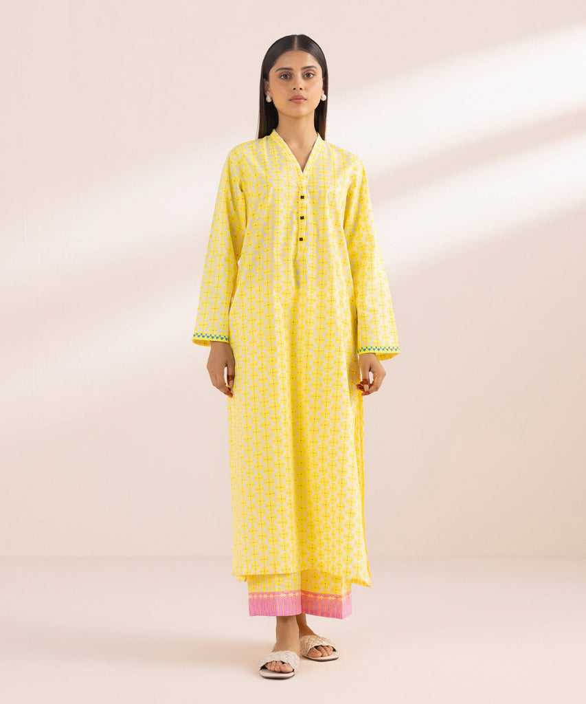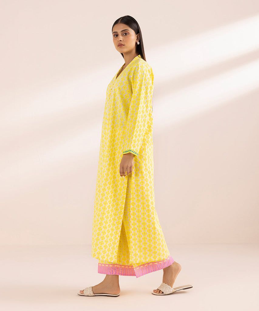 Add a pop of colour to your wardrobe with our neon yellow, printed cambric, long A-line shirt.
