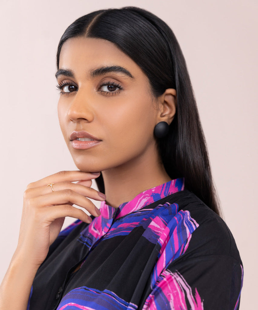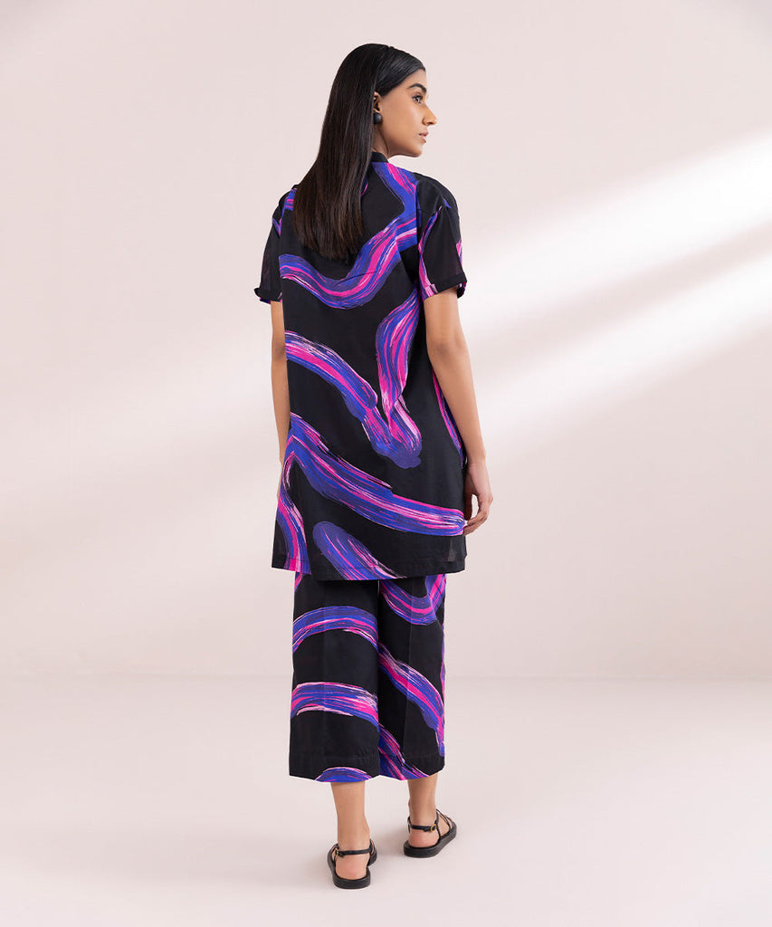 Elevate your summer style in our black and purple, printed boxy shirt featuring a band neckline with placket.