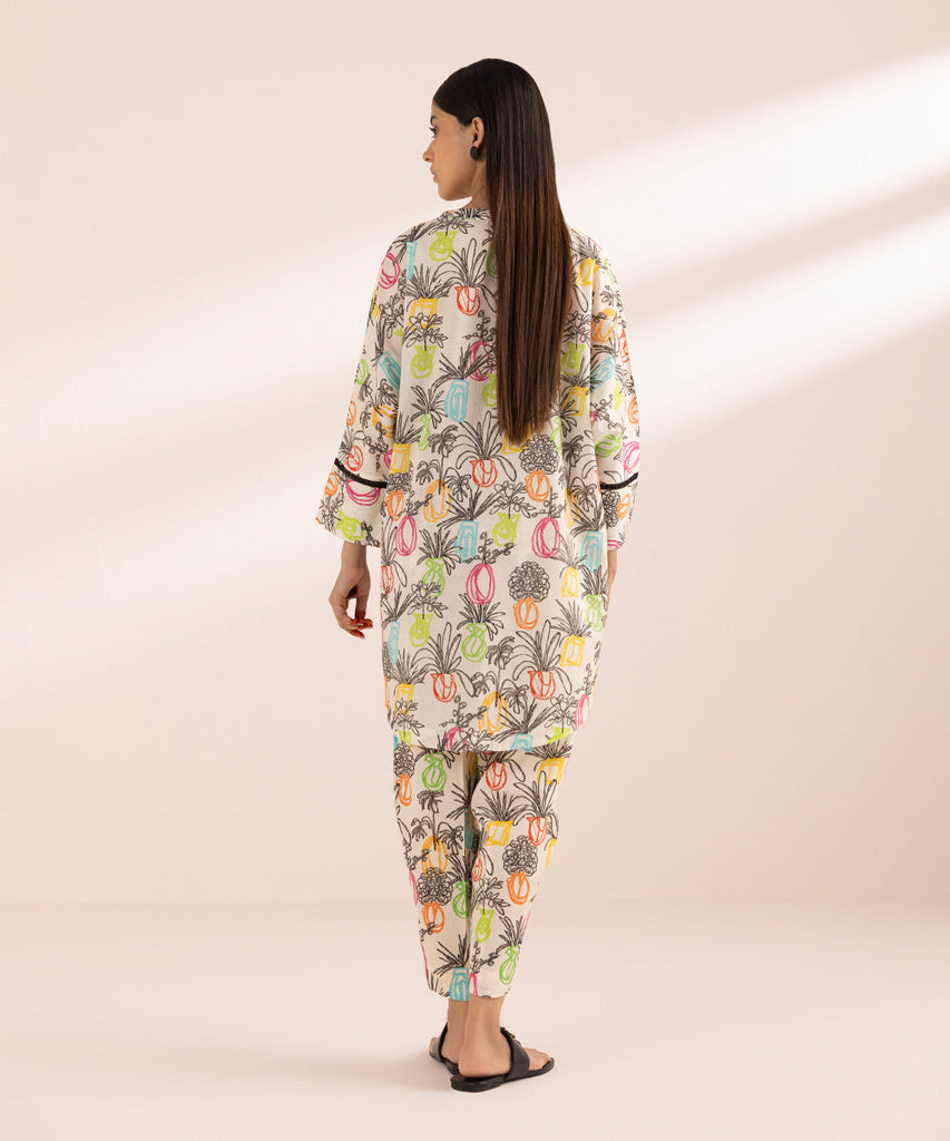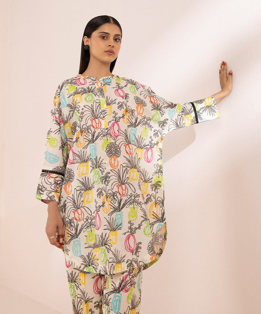 Curate a playful summer look with our printed cream white, textured lawn drop shoulder shirt featuring a band neckline with placket.