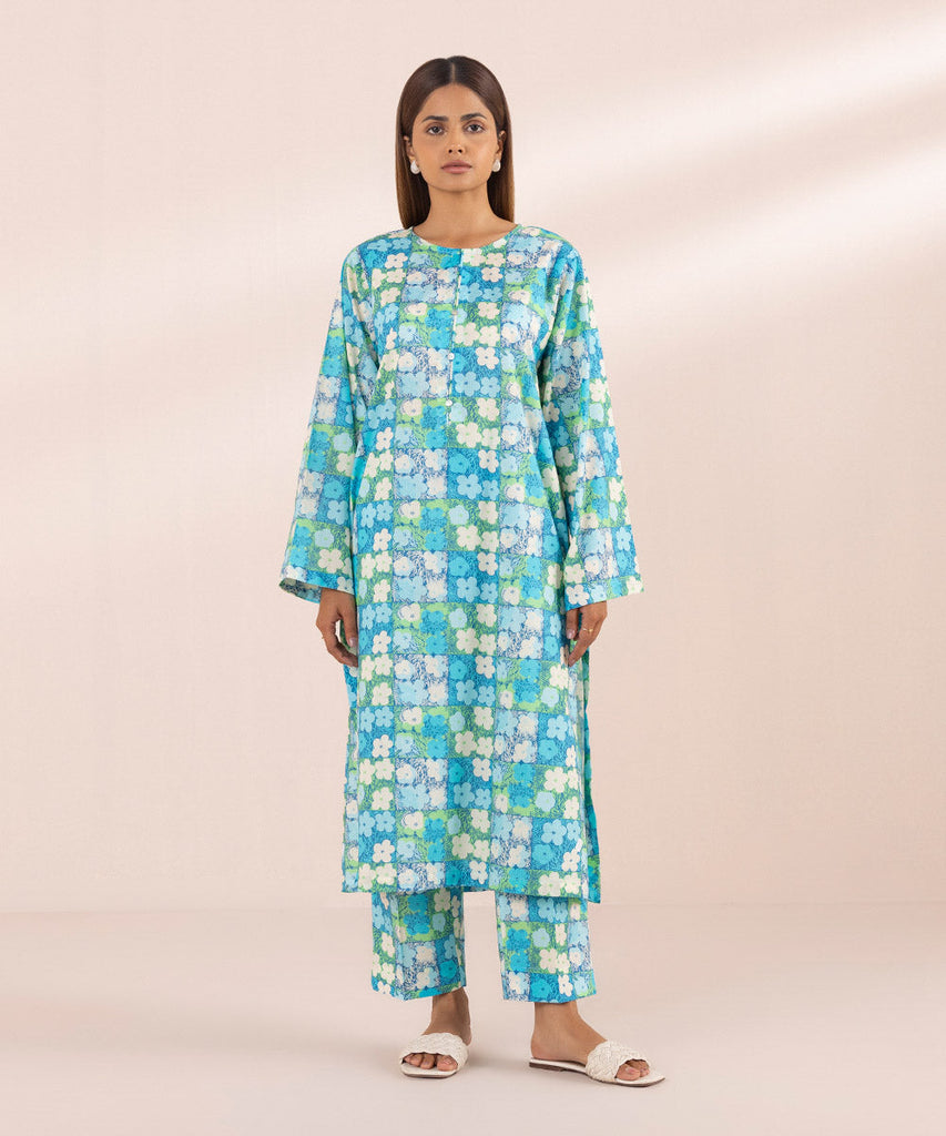 Opt for a chic everyday look with our printed sky blue, long A-line shirt in textured lawn