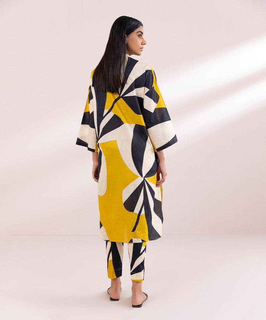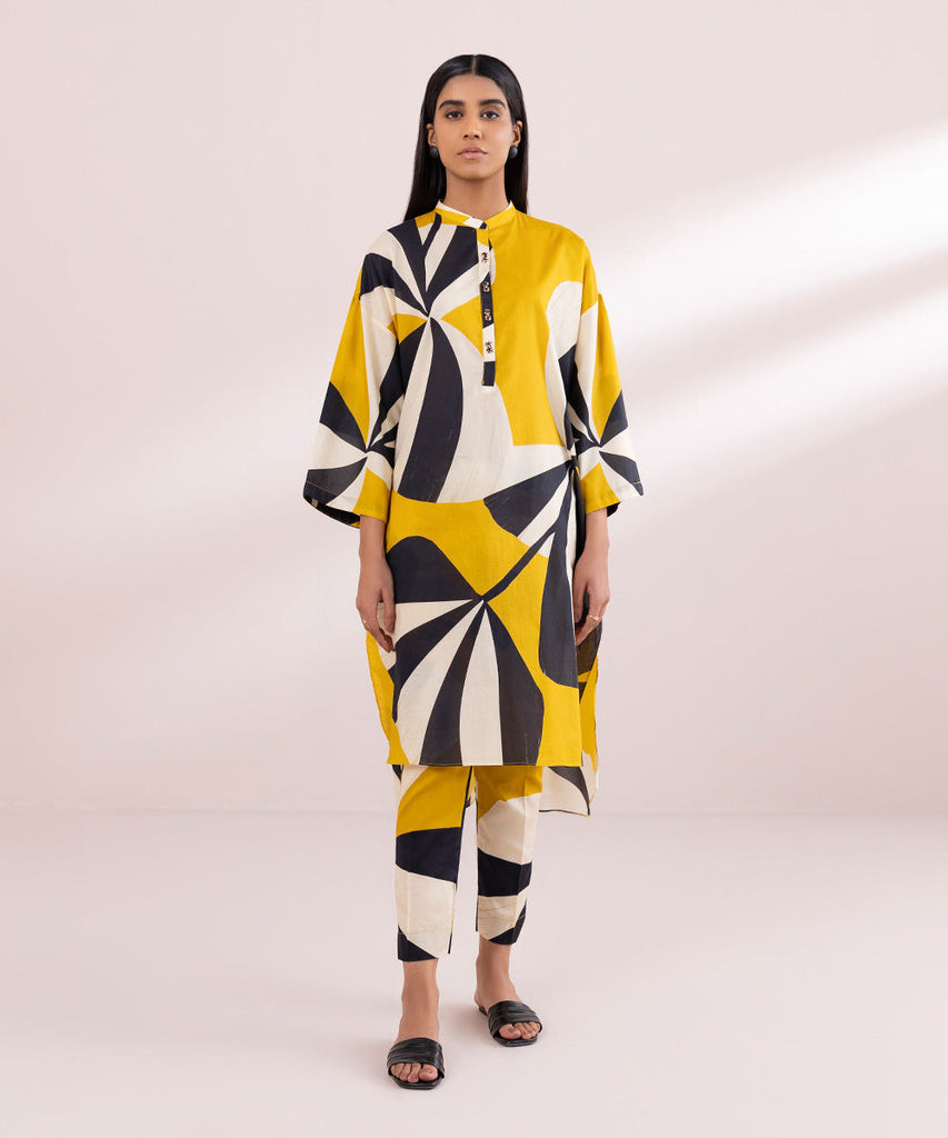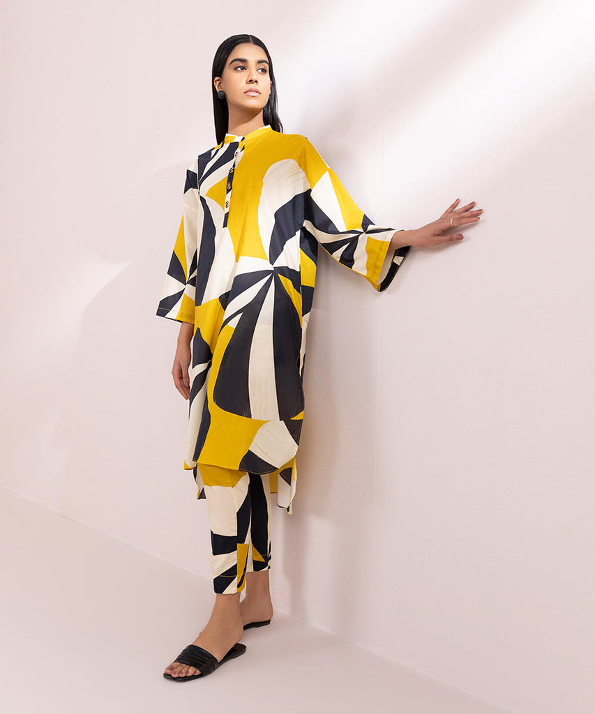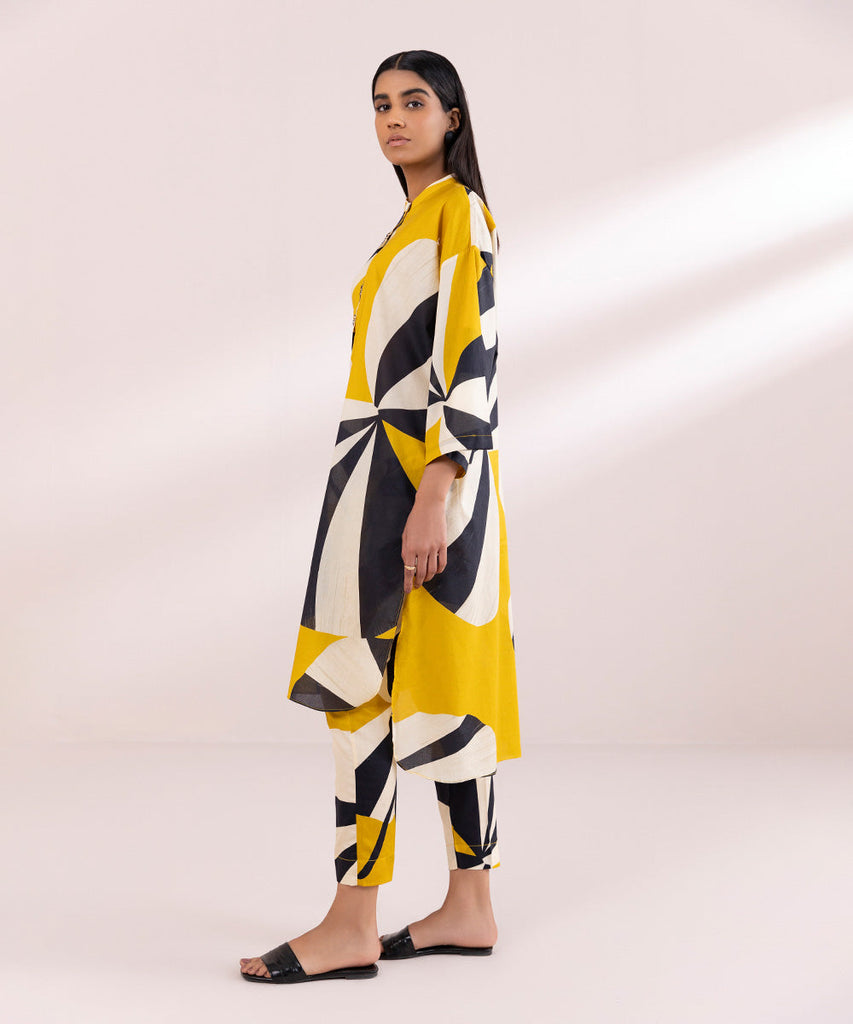 Boxy ShirtElevate your summer style with our mustard and black printed boxy shirt, featuring a band neckline with pla...