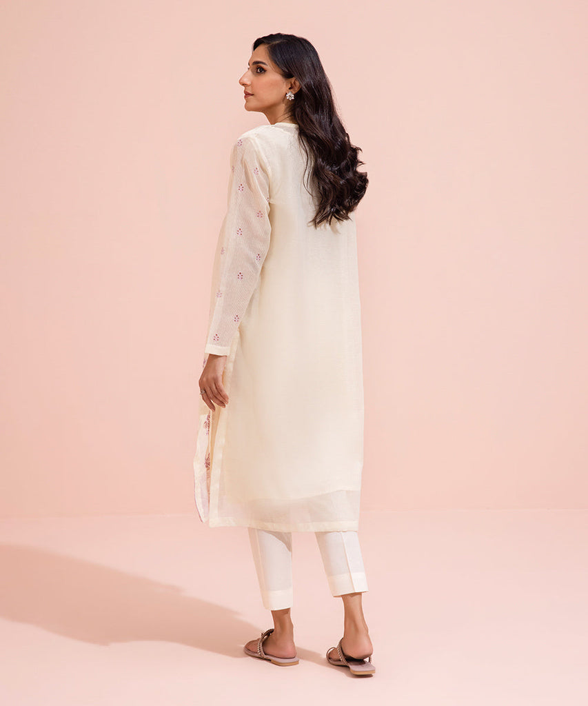 Our off white karandi dobby straight silhouette embossed with intricate embroidery is the perfect outfit for Eid.