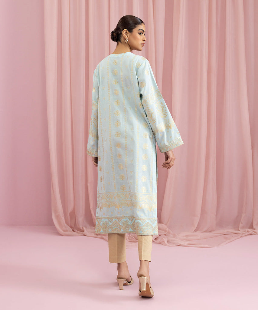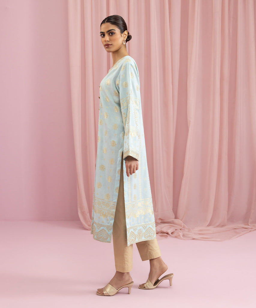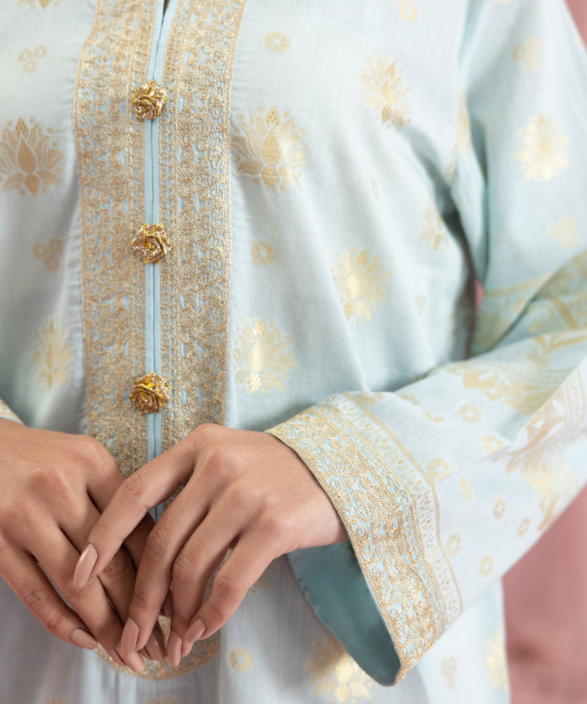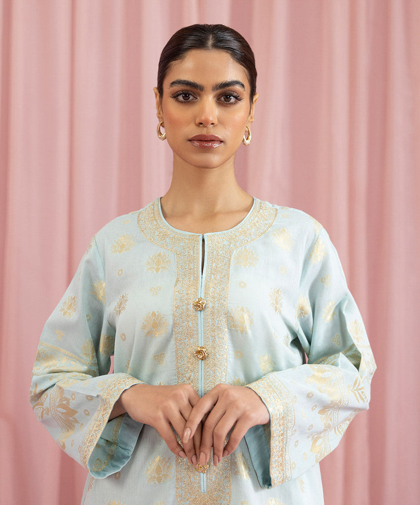 This Eid, strut in style in sky blue jacquard straight silhouette featuring intricate embroidery detailing.