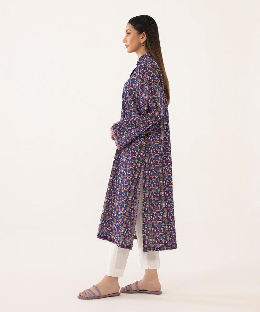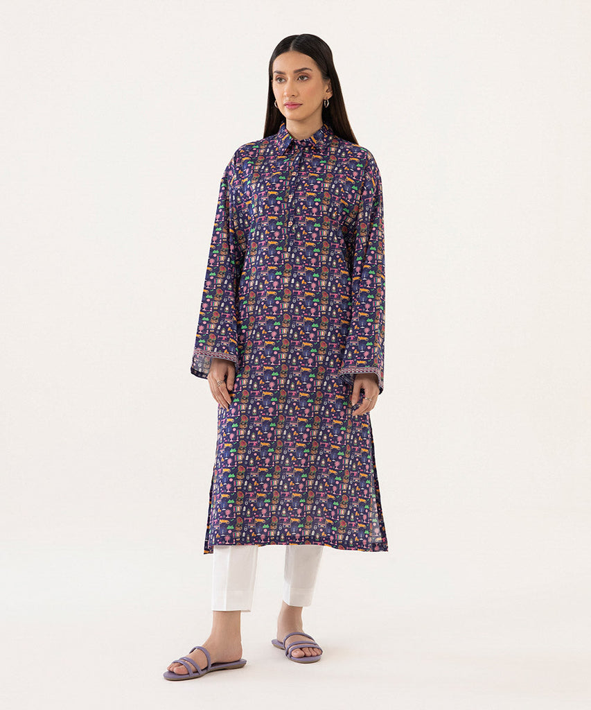 Printed Front, Printed Back, Full Sleeves With Embroidery On Cuff, Collared Neckline