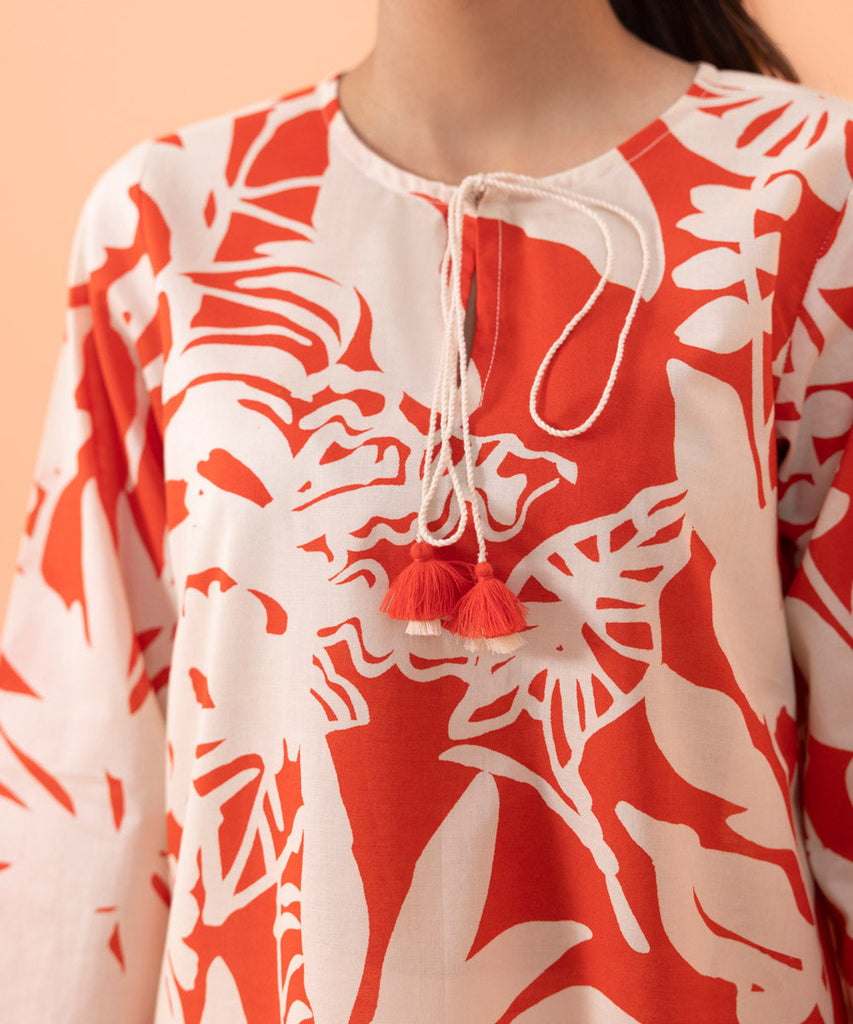 Add a playful twist to your wardrobe with our beige-red straight silhouette accented with leafy patterns.