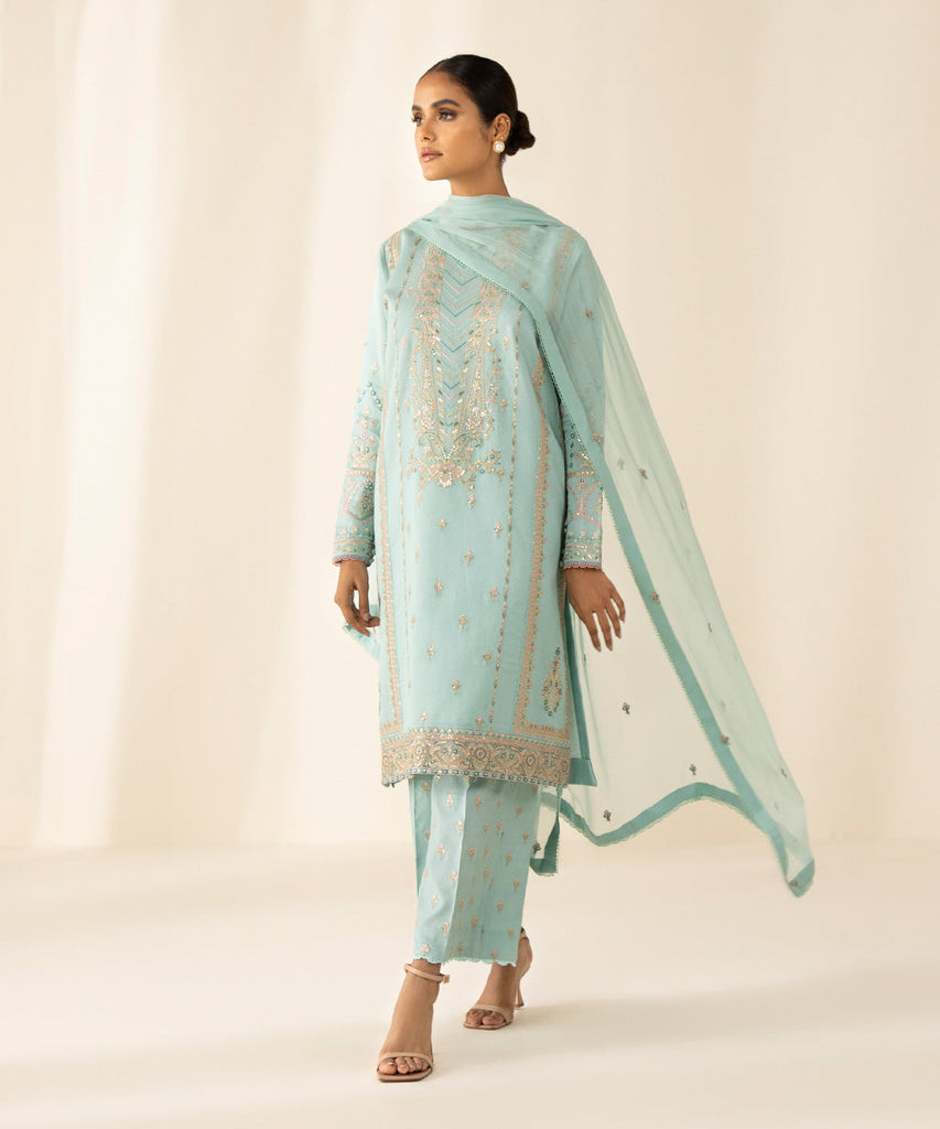 Inspired by ethnic embroideries, our three-piece silk cotton net ensemble on an aqua canvas pays homage to South Asian traditional craftsmanship. Our luxurious ensemble is paired with a chiffon dupatta and silk pants that add a touch of opulence and luxury.