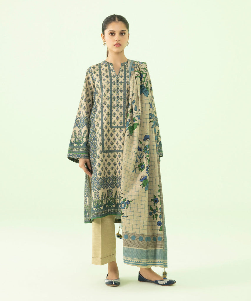 Embody the mystical allure of the winter sky with our timeless beige three-piece accented with floral patterns paired with a poly shawl.