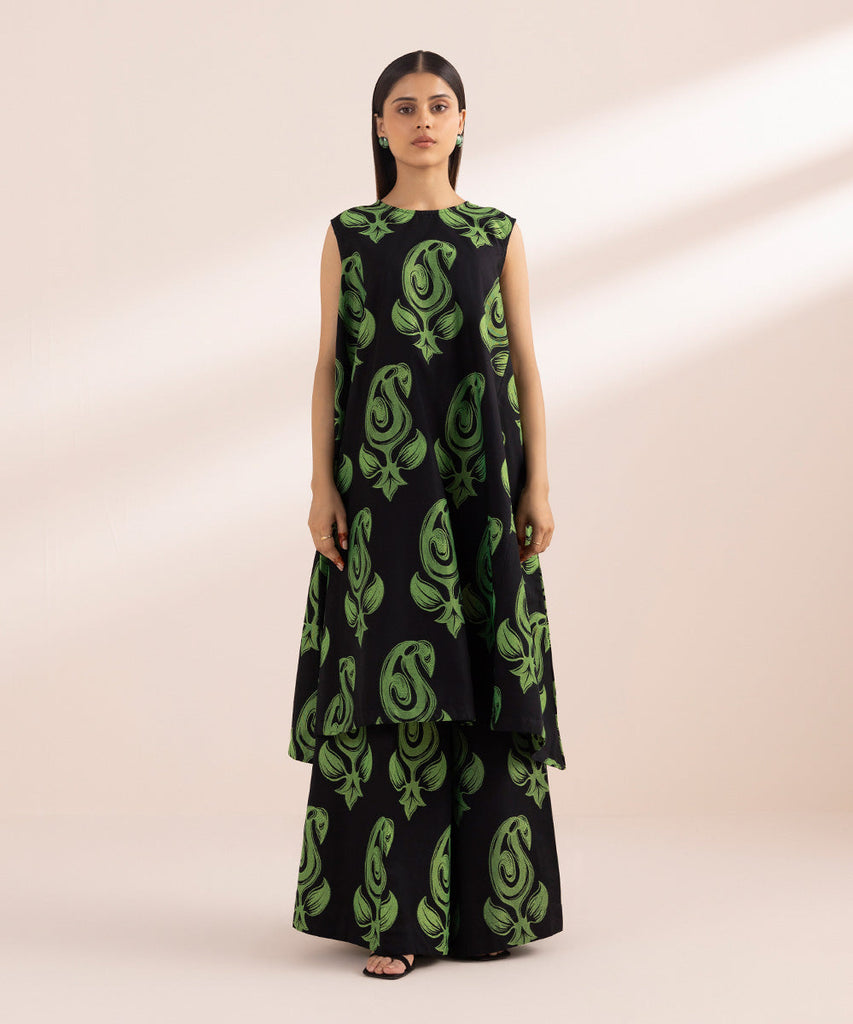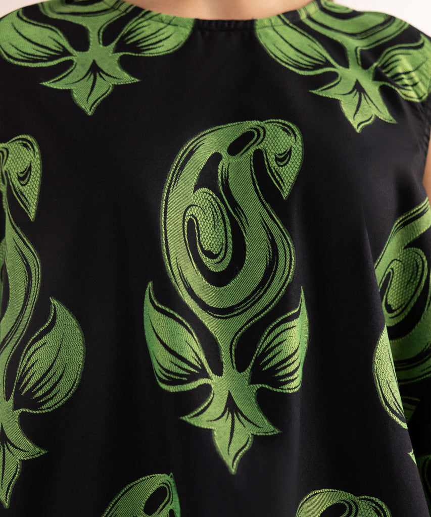 Channel effortless style in our dyed black, extra weft jacquard, long A-line sleeveless shirt.