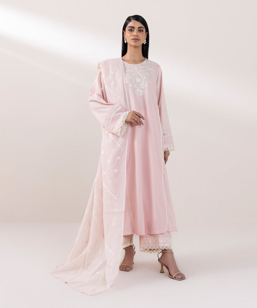 Wrap yourself in elegance with our pastel pink, blended textured karandi dupatta featuring embroidery.