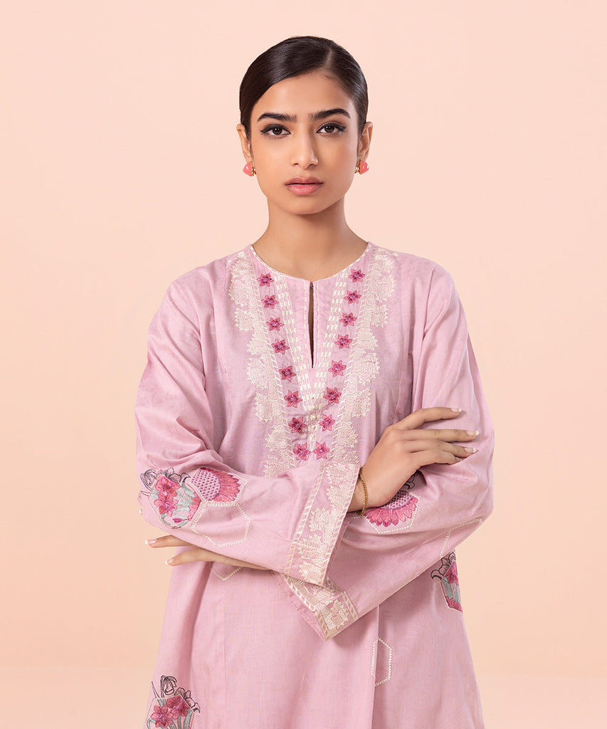 Dyed Embroidered Front, Dyed Plain Back, Full Sleeves With Embroidery, Crew Neckline With Slit