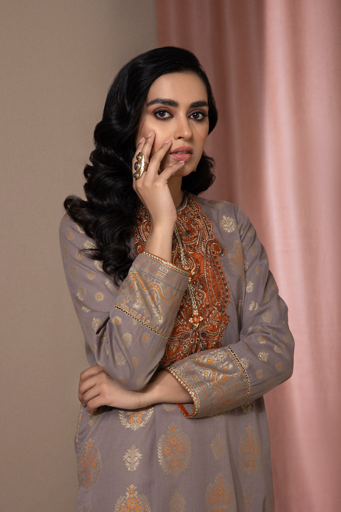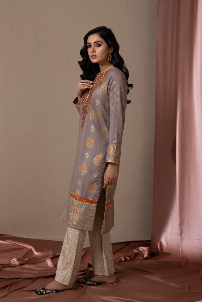 Make a gorgeous statement in this elegant pale purple extra weft jacquard pret kurta with an A-line silhouette with an embroidered motif .