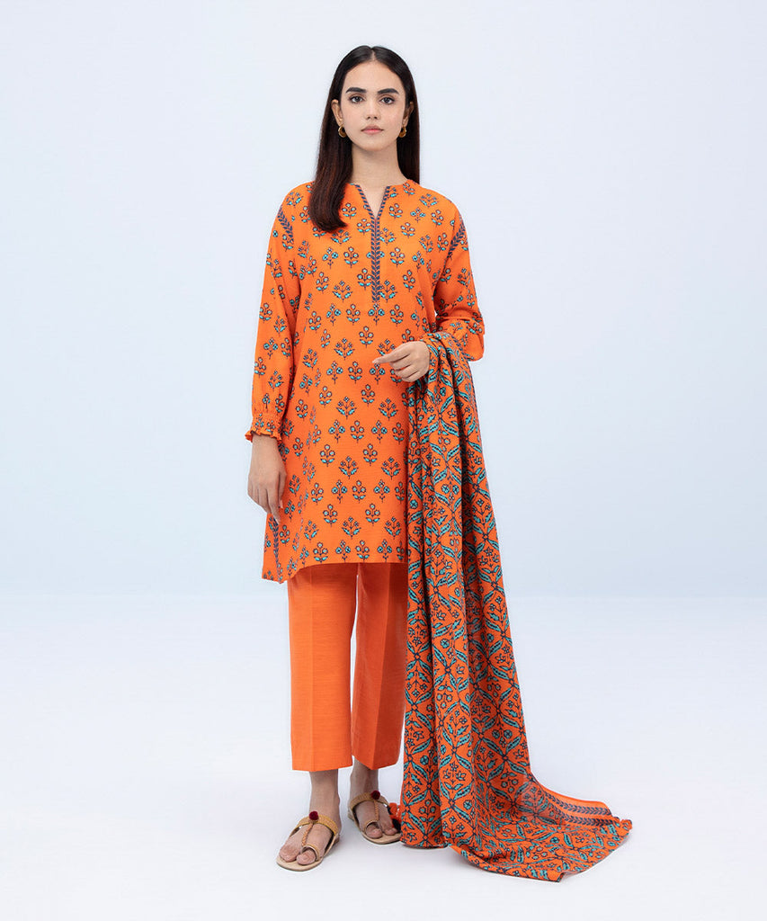 Upgrade your wardrobe with our tangerine three-piece featuring floral patterns. Unstitched 3-PieceShirt: Printed Khad...
