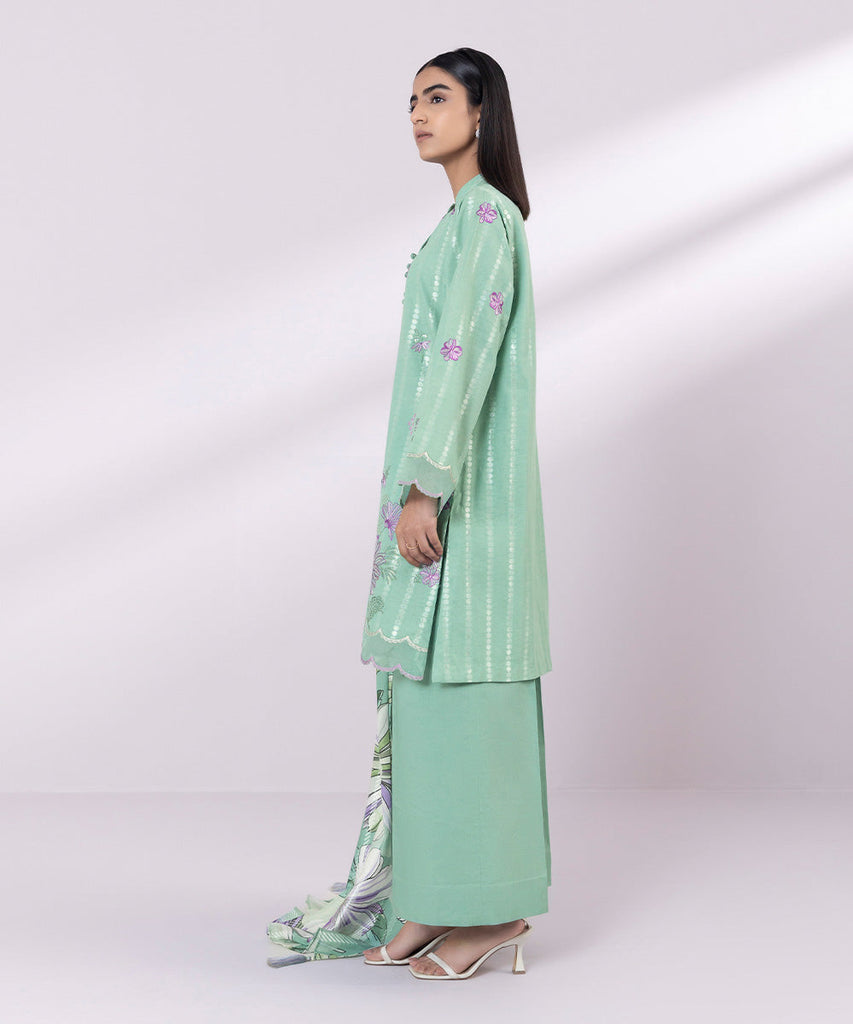 Straight KurtaCreate a memorable look this Eid in our sea green, embroidered extra weft jacquard straight shirt with ...