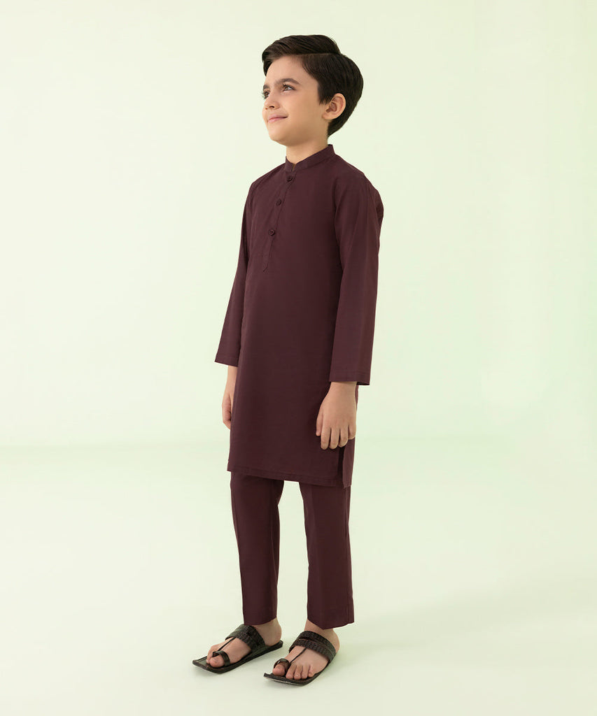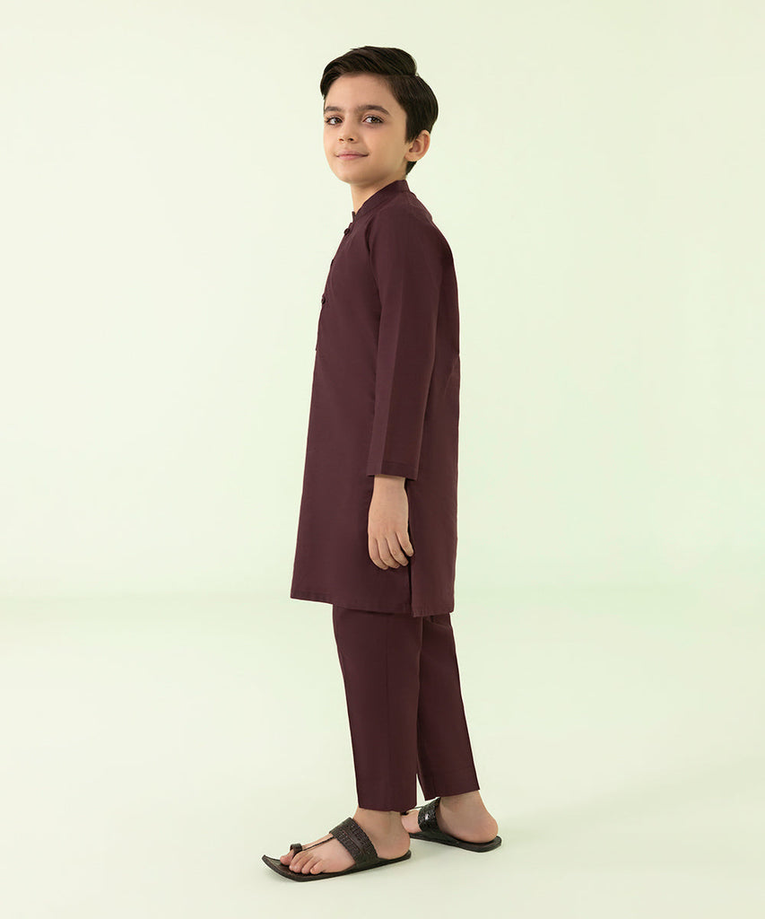 Dress your little one in maroon two-piece suit featuring straight kurta with print detailing.