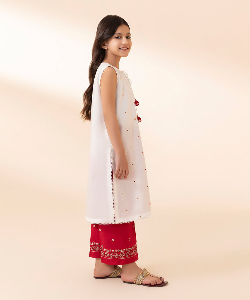 Create a playful spring look in this white, cambric, sleeveless shirt, featuring Chikankari embroidery and tassel details.