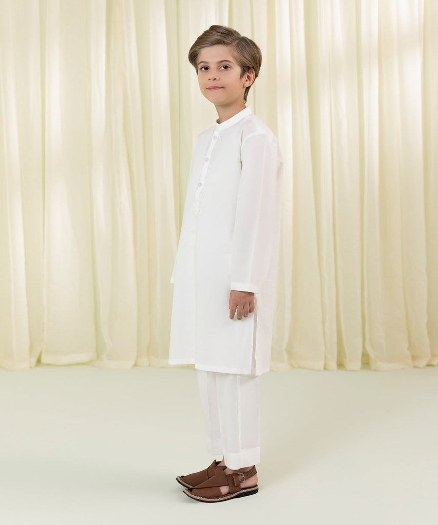 Curate a dapper look for your little man in our white straight kurta with embroidery on neckline.