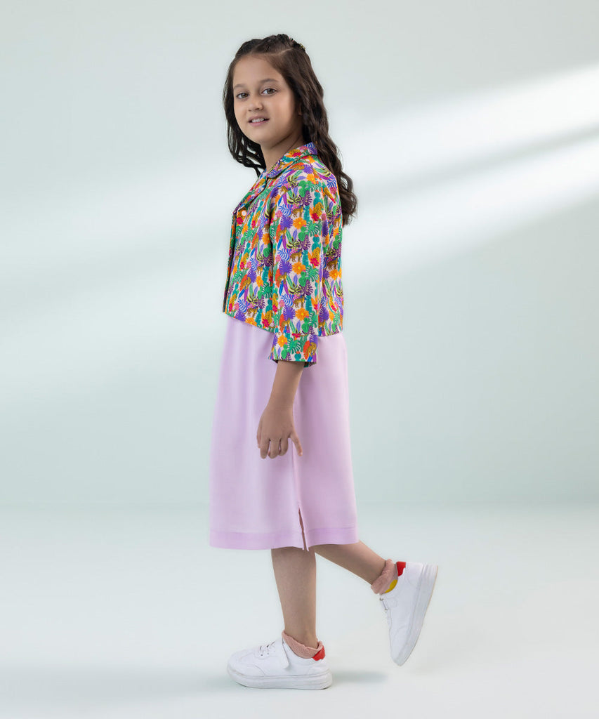 Curate the perfect style statement for your little princess with our lilac sleeveless plain dress with printed jacket.
