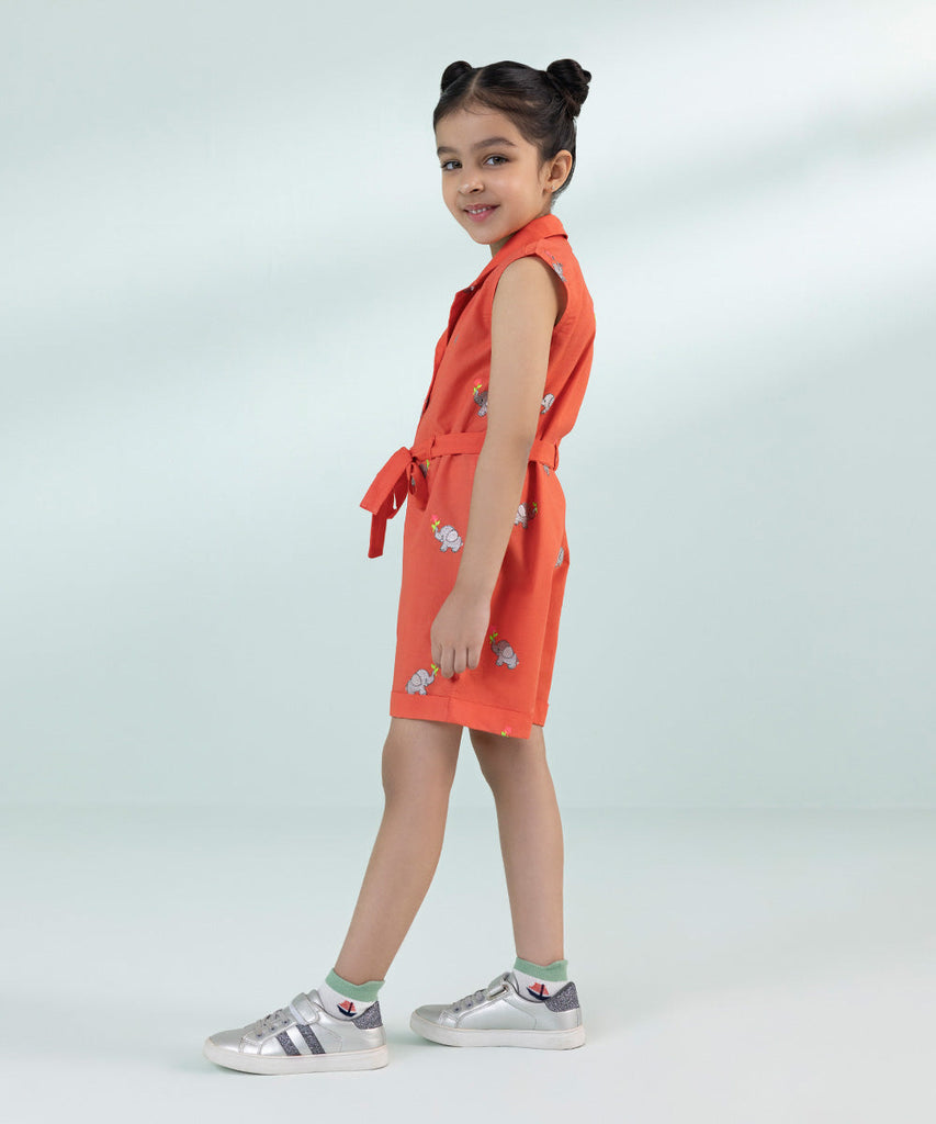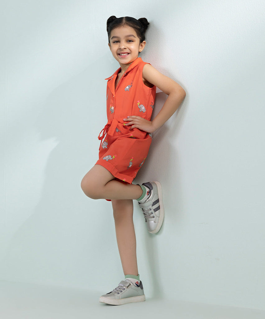 Curate the perfect summer wardrobe for your little princess with our orange all-over embroidered play suit.