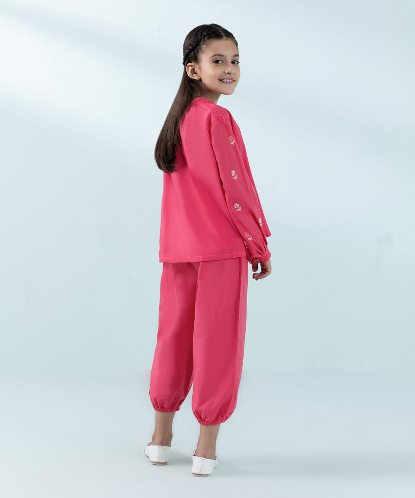 Let your little princess make a statement with our pink all-over embroidered loose fit shirt paired with straight trousers.