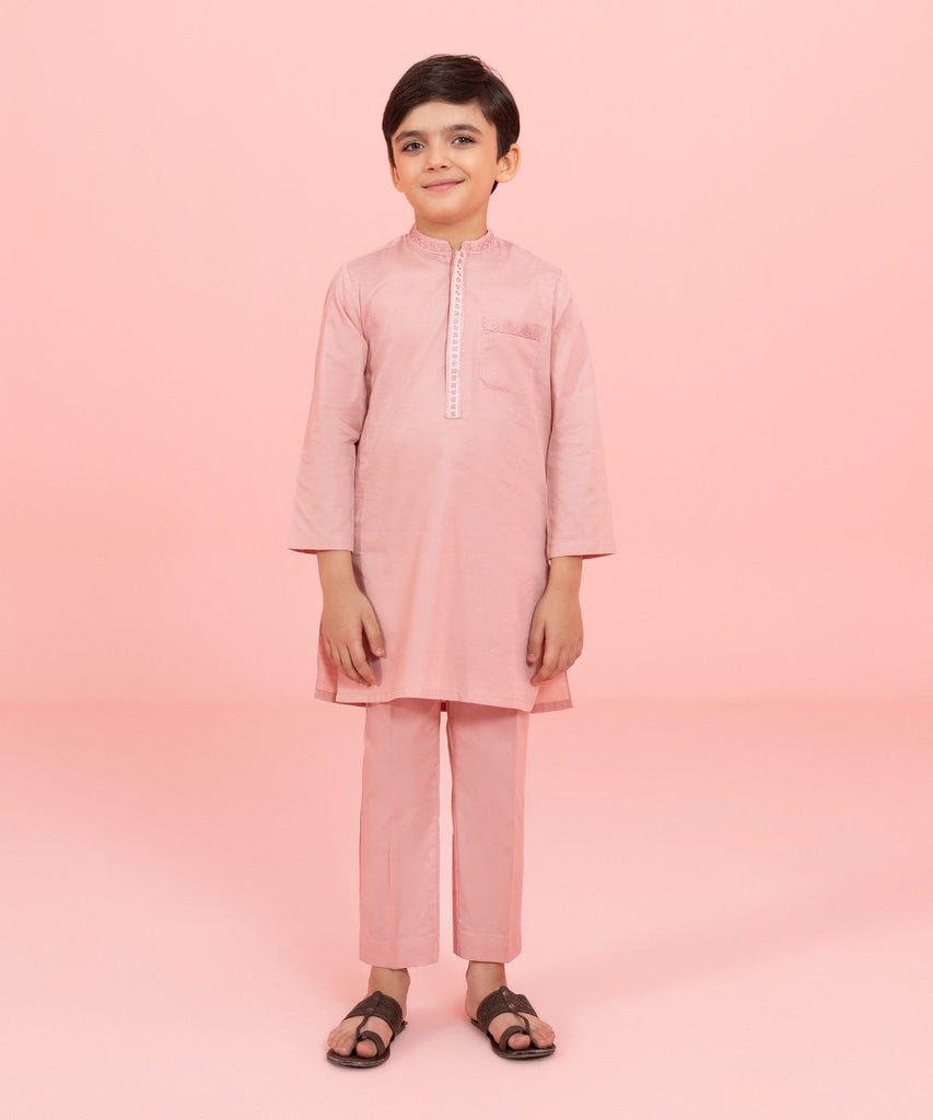 Classic two-piece slub cotton suit for your little one in light pink featuring embroidery on band neckline and pocket.