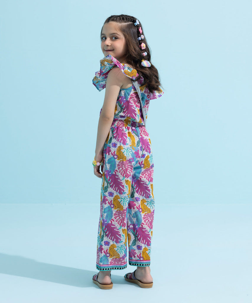 Printed ruffled neck jumpsuit with smocking effect stitching detail.