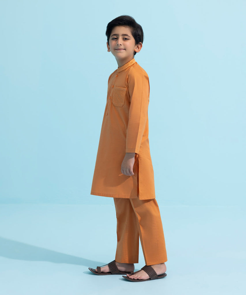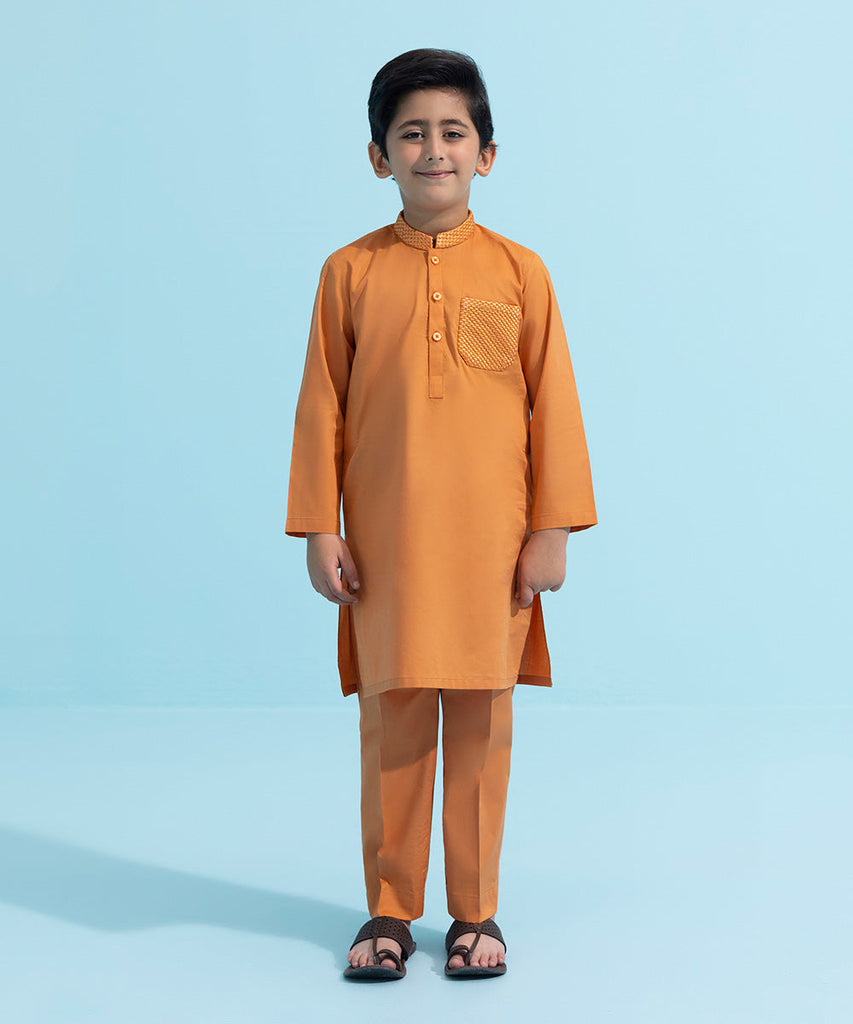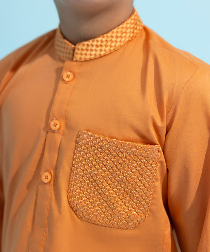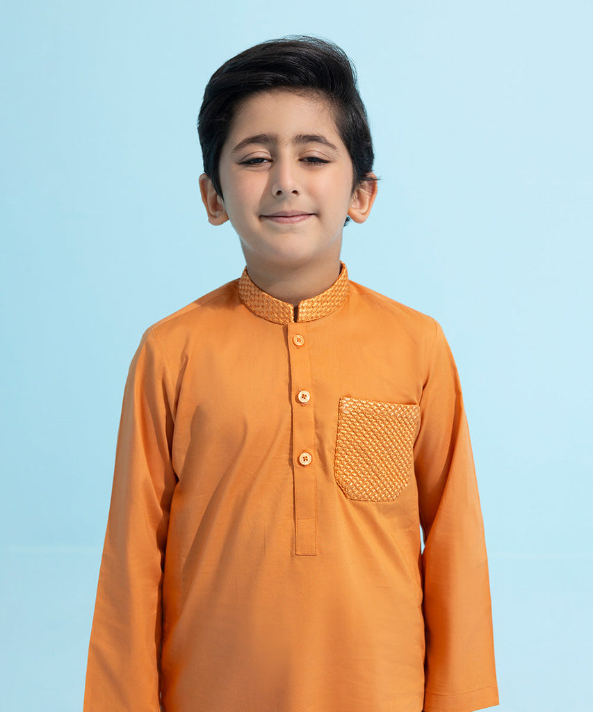 Dress your little one in orange embroidered herringbone two-piece ensemble. Straight KurtaEmbroidered band and pocket...
