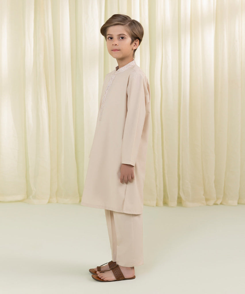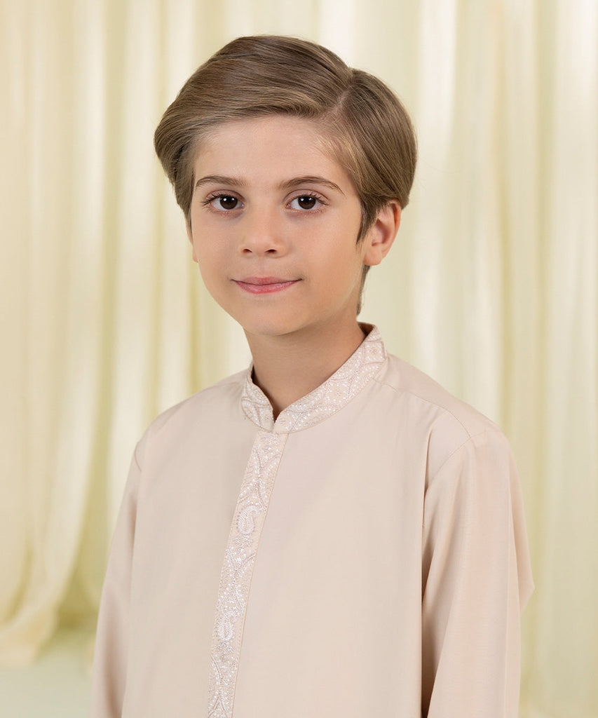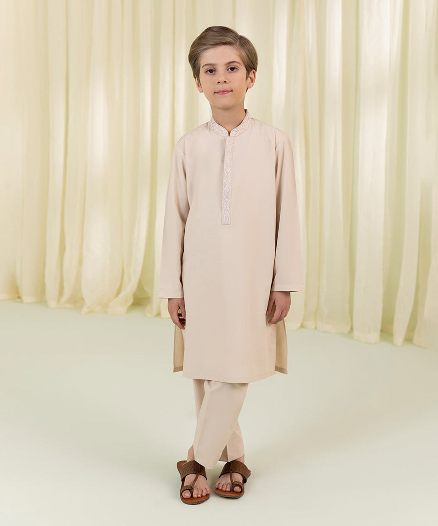 Elevate your little one's festive style with our beige embroidered kurta and straight pants.