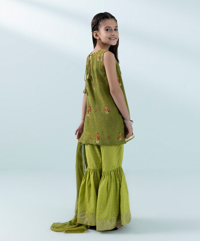 Curate the perfect festive look for your little one with our green all-over embroidered straight shirt paired with a gharara and viscose chiffon dupatta.