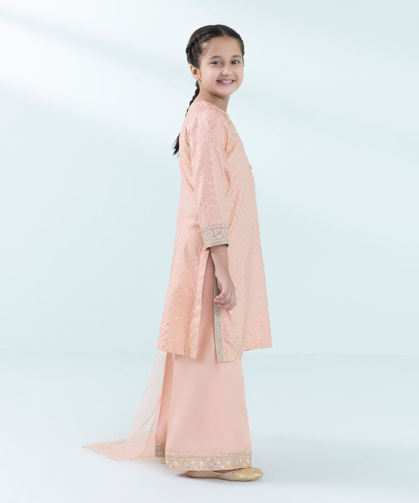 Curate the perfect festive look for your little one with our foil-printed A-line shirt paired with culottes and organza dupatta.