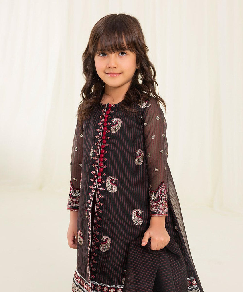Dress your little one in our black zari line front open shirt with embroidered front and sleeves paired with a maroon lehnga and an organza zari line dupatta.