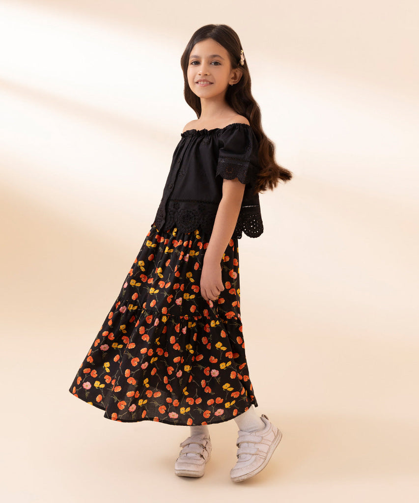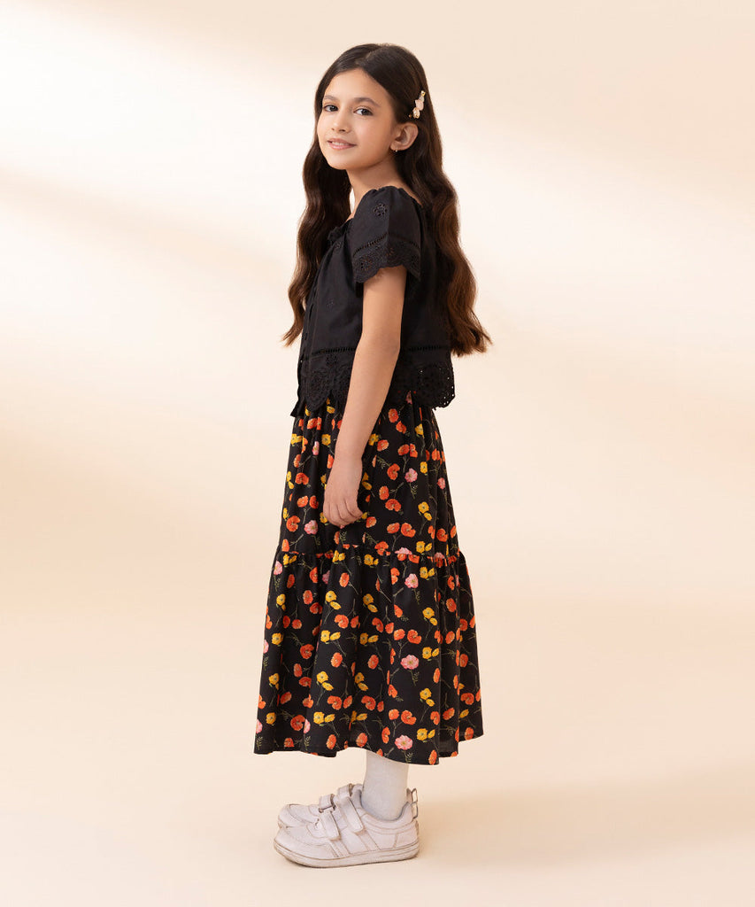 Make your little princess stand out in our black embroidered top paired with a printed, floral tiered skirt.TopEmbroi...
