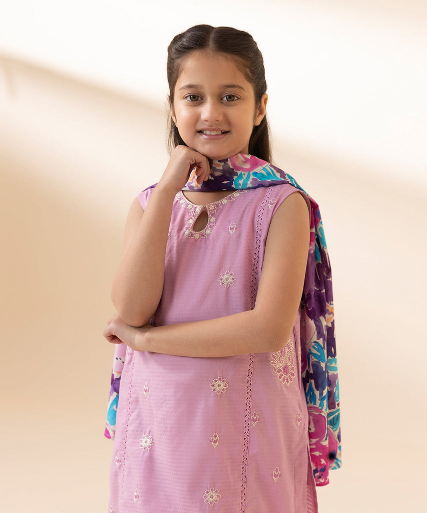Adorn your little girl in our lilac Chickankari shirt with lace paired with straight trousers.