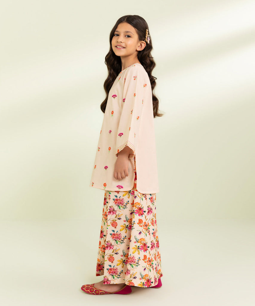 This Eid, dress your little one in florals with our cream all-over embroidered shirt and multi-coloured printed sharara.