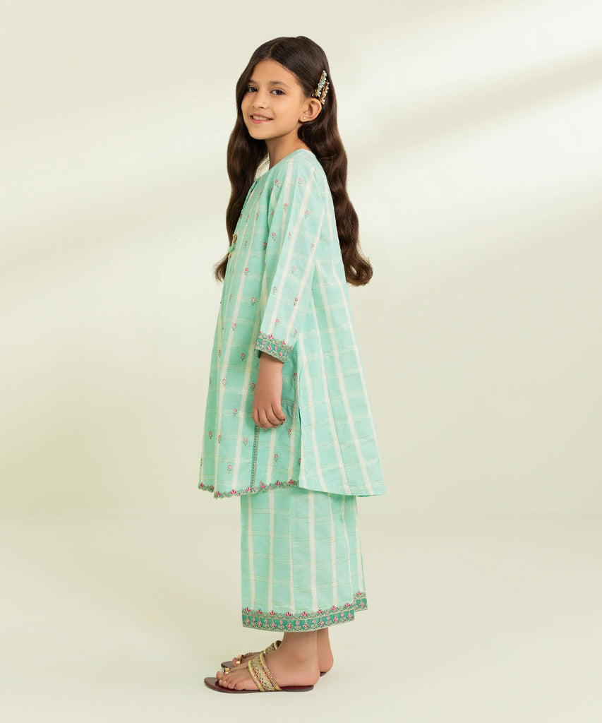 Dress your little diva in florals with our sky blue schiffli straight shirt and matching culottes, featuring embroidery.