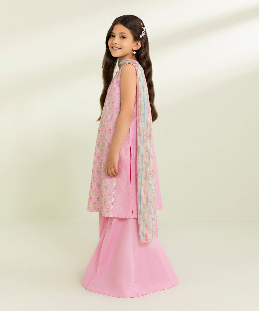 Let your little one make a statement in our three-piece, floral zari lawn suit in pink, featuring an all-over embroidered shirt, paired with a matching sharara, and sky blue dupatta.