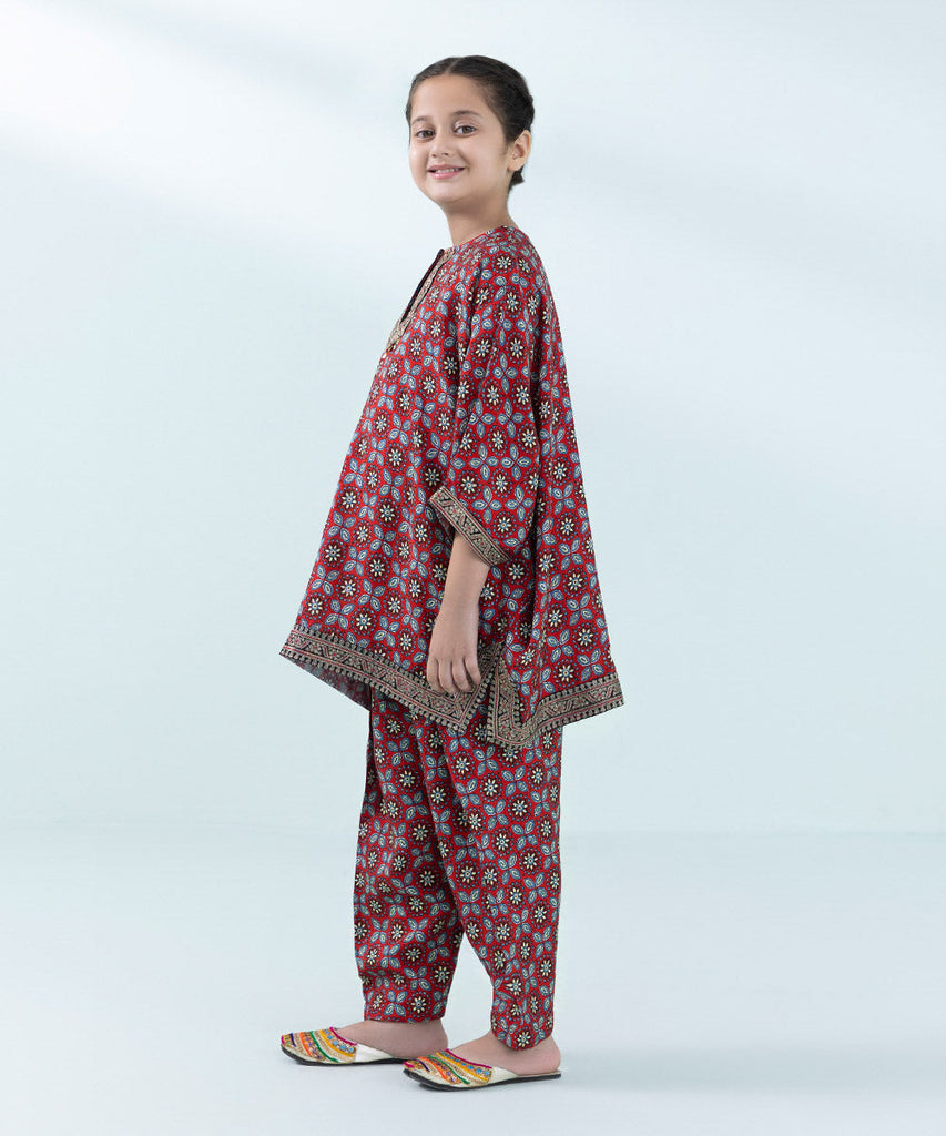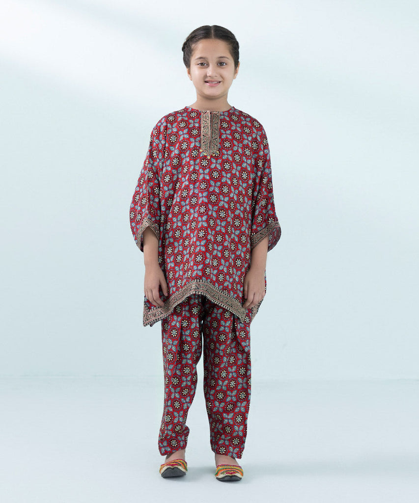 Curate the perfect festive look for your little one with our maroon embroidered raw silk boxy shirt paired with a printed shalwar.
