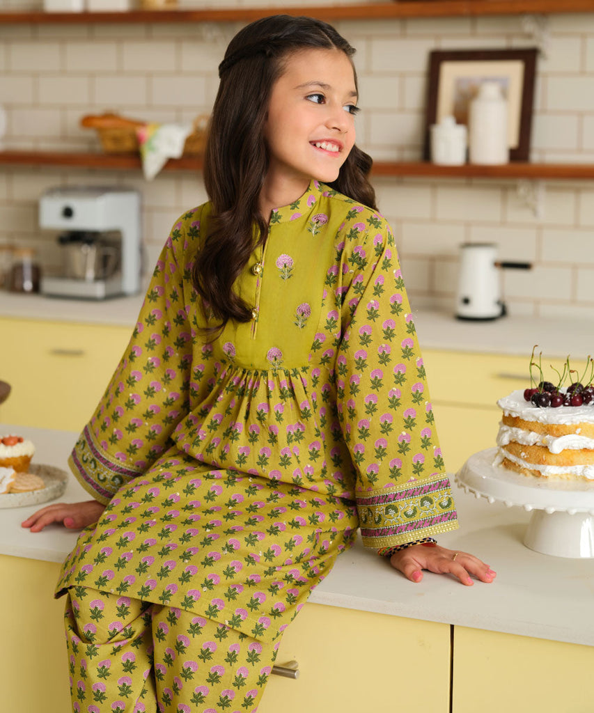 Elevate your festive style with our green A-line embroidered shirt paired with printed shalwar.