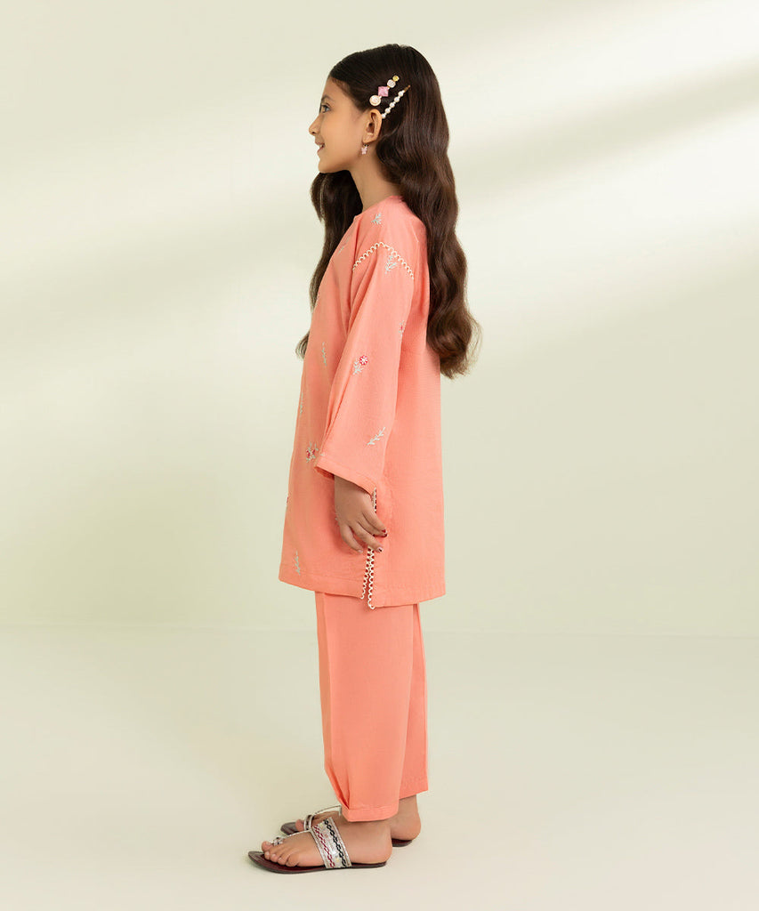 This Eid, dress your little one in our pink drop shoulder shirt with all-over embroidery and lace details, paired with shalwar.